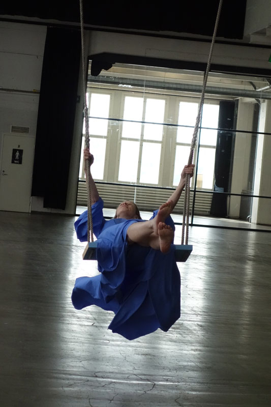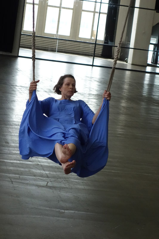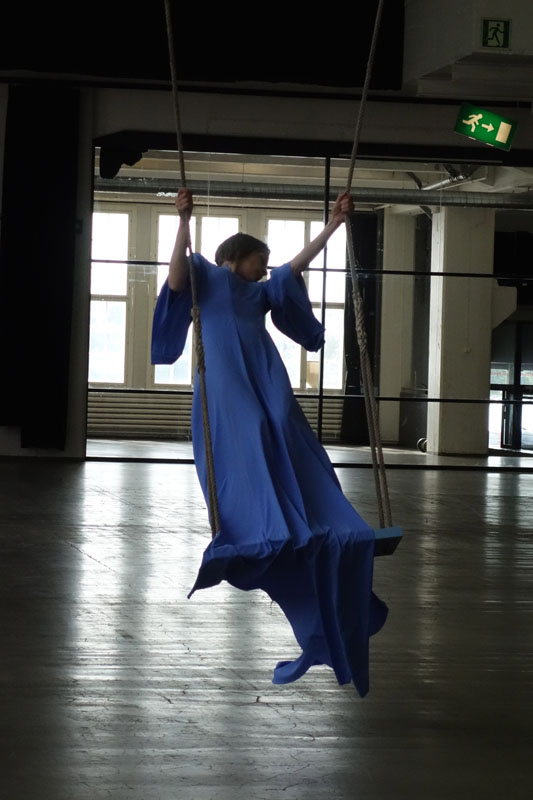 A blue swing in the 13,5 m high and 110 m long hall, and a swinger in blue.